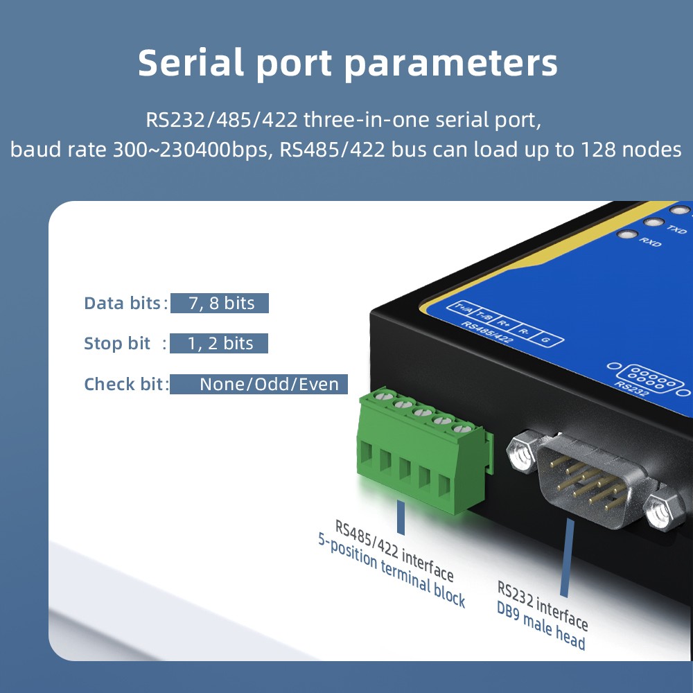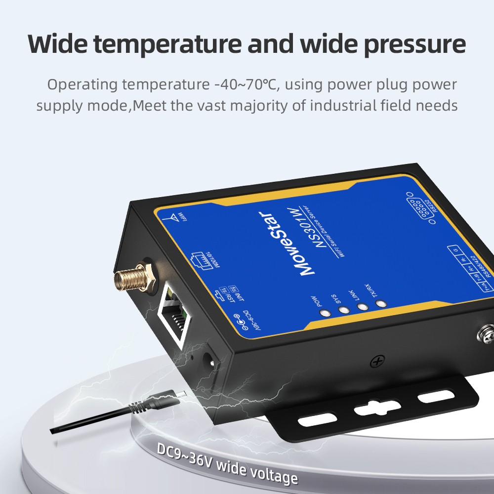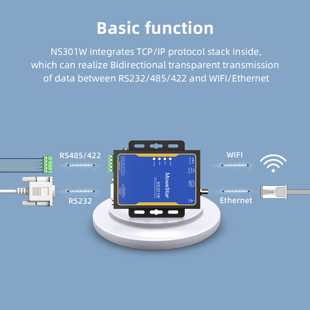 ● Support RS-232/485/422 to Wi-Fi/Ethernet data transmission, serial rate up to 230400bps ● Support 802.11 b/g/n standard ● Support wireless operation AP/Client/AP+Client mode ● Support IP-MAC binding, static routing, PPPoE, DHCP, static IP and AUTO-IP functions ● Support WAN/LAN mode switching