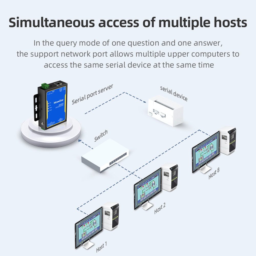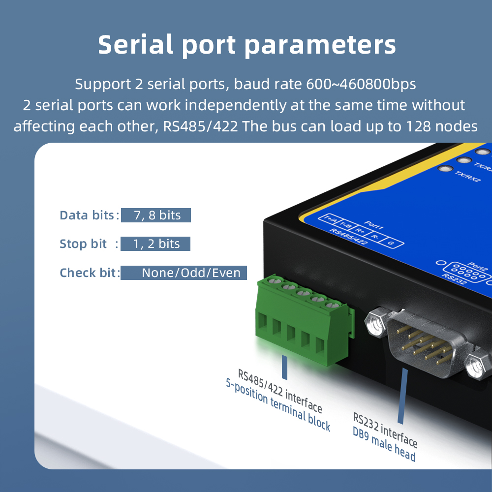 Industrial serial port server series products, mainly realize the data transmission between Ethernet and serial port (RS-232/RS-485/RS-422), it integrates the TCP/IP protocol stack, RS-232/RS-485/RS-422 devices that are not connected to the Internet can also be easily, flexibly and quickly connected to Ethernet. The series of products use high-performance ARM chip to ensure stable data transmission; Support a variety of working modes to meet different application requirements; Excellent anti-interference performance, suitable for harsh industrial environments. ● RS-232/RS-485/RS-422 serial interface up to 2kV surge protection ● Up to 6kV lightning protection on Ethernet interface ● Support Modbus RTU/ASCII to Modbus TCP conversion ● Support VirtualCOM software management