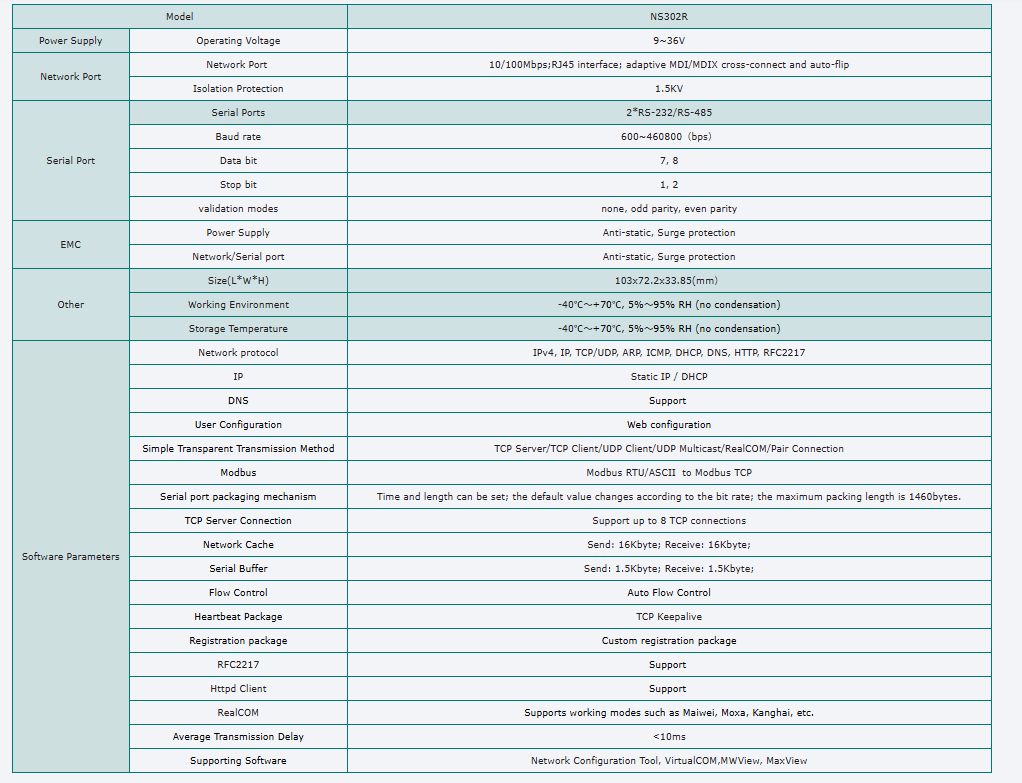 SupportTCP Server/TCP Client/UDP/UDP multicast/RealCom/Pari Connection/HTTPD and other working modes