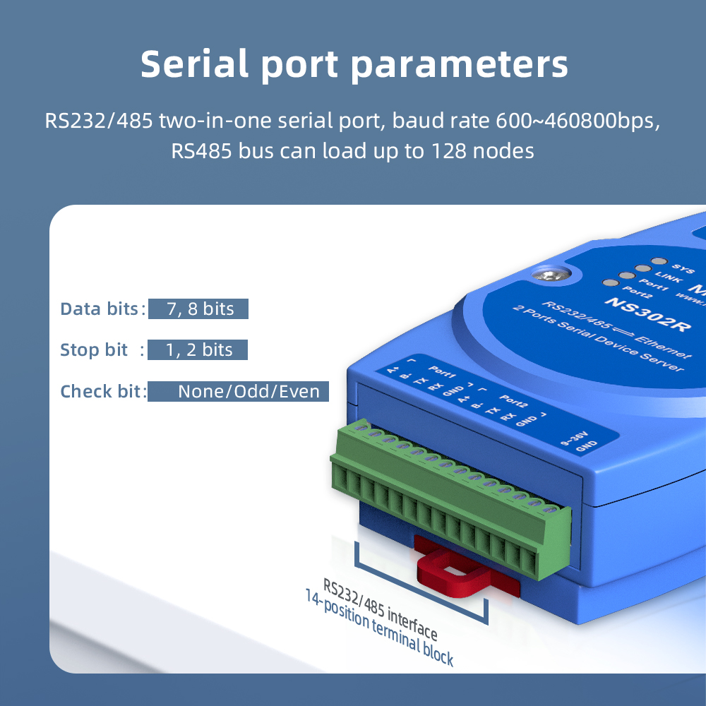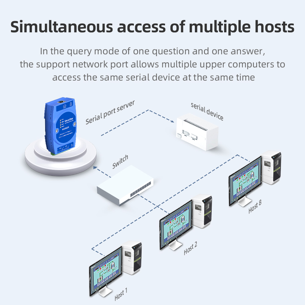 Industrial serial port server series products, mainly realize the data transmission between Ethernet and serial port (RS-232/RS-485/RS-422), it integrates the TCP/IP protocol stack, RS-232/RS-485/RS-422 devices that are not connected to the Internet can also be easily, flexibly and quickly connected to Ethernet. The series of products use high-performance ARM chip to ensure stable data transmission; Support a variety of working modes to meet different application requirements; Excellent anti-interference performance, suitable for harsh industrial environments.