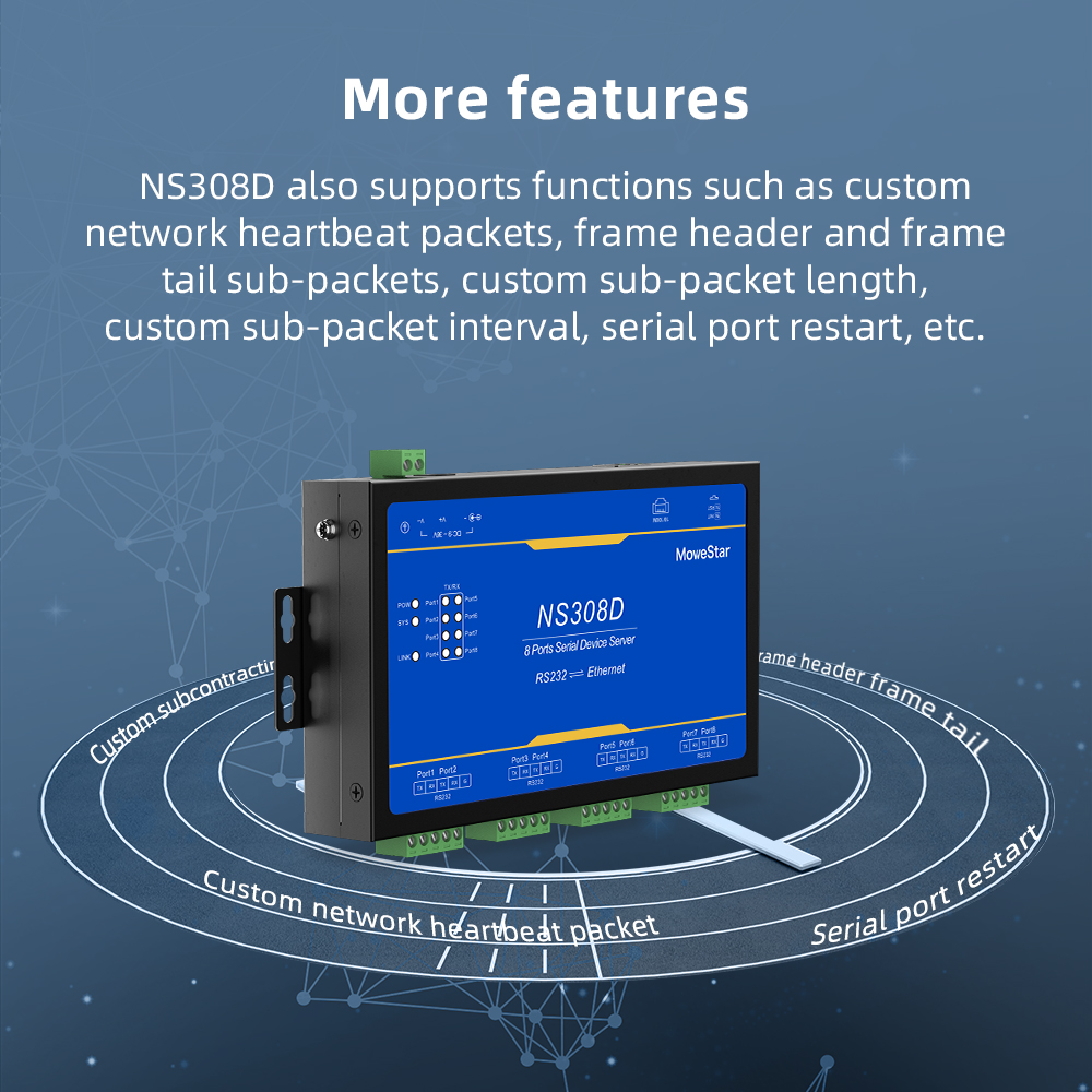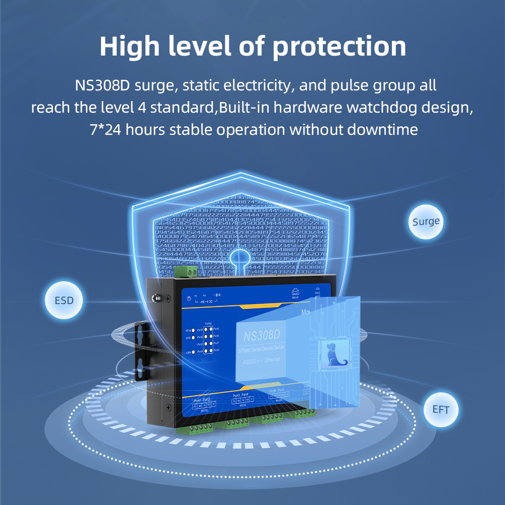Industrial serial port server series products, mainly realize the data transmission between Ethernet and serial port (RS-232/RS-485/RS-422), it integrates the TCP/IP protocol stack, RS-232/RS-485/RS-422 devices that are not connected to the Internet can also be easily, flexibly and quickly connected to Ethernet. The series of products use high-performance ARM chip to ensure stable data transmission; Support a variety of working modes to meet different application requirements; Excellent anti-interference performance, suitable for harsh industrial environments.