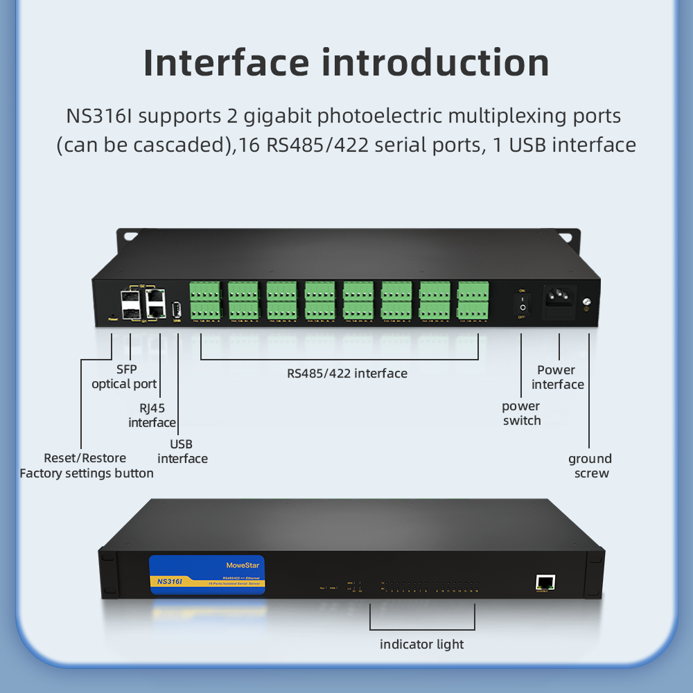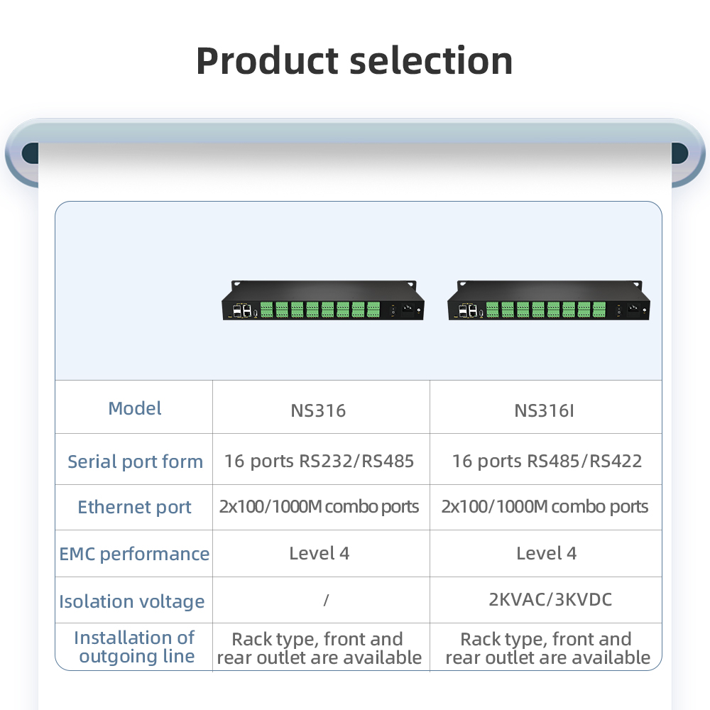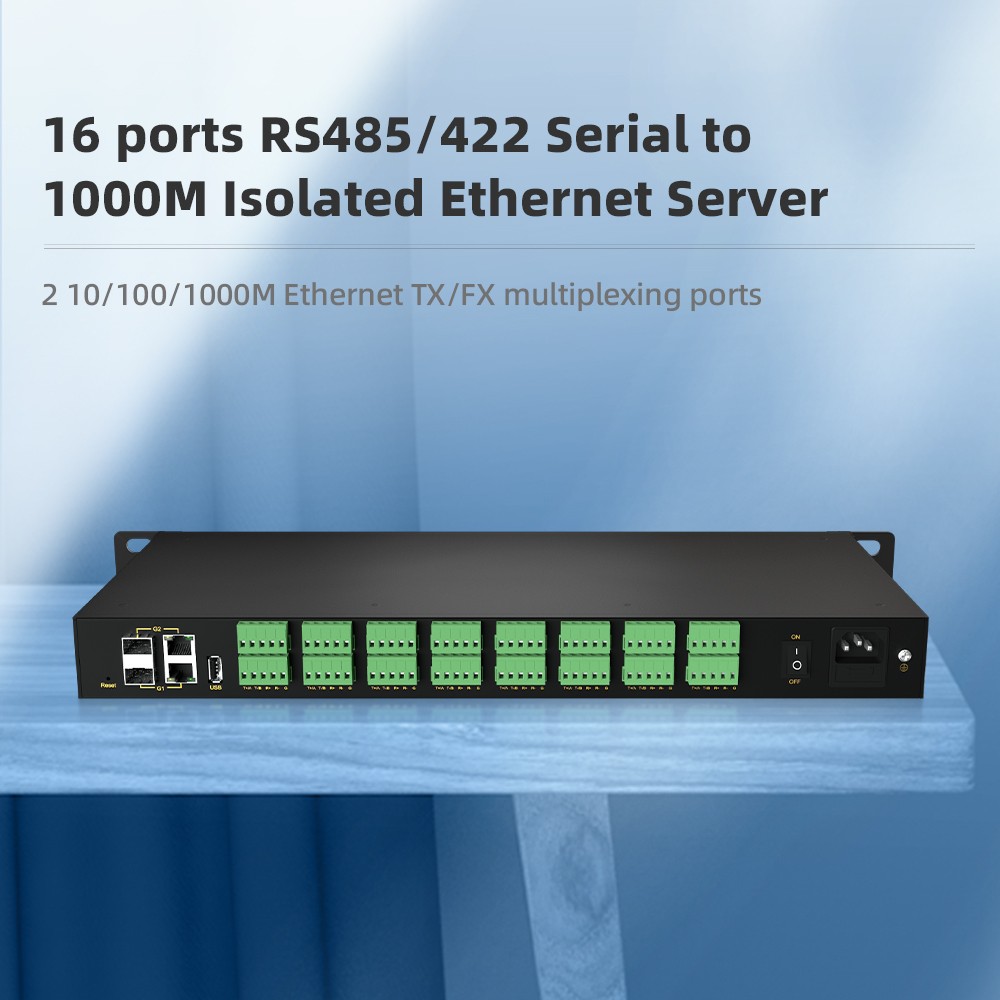 Industrial serial port server series products, mainly realize the data transmission between Ethernet and serial port (RS-232/RS-485/RS-422), it integrates the TCP/IP protocol stack, RS-232/RS-485/RS-422 devices that are not connected to the Internet can also be easily, flexibly and quickly connected to Ethernet. The series of products use high-performance ARM chip to ensure stable data transmission; Support a variety of working modes to meet different application requirements; Excellent anti-interference performance, suitable for harsh industrial environments. ● Adopt 32-bit Arm Cortex-M7 core CPU ● 8 ports RS422/RS485 to 2*10/100M Ethernet ports ● Support opto-isolation
