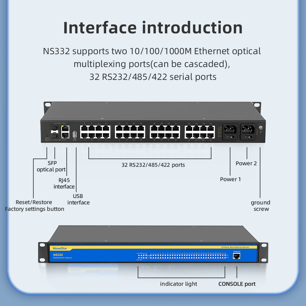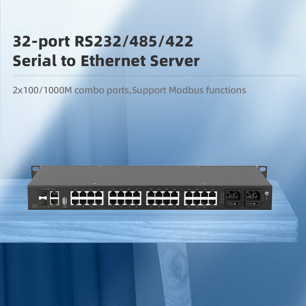 Industrial serial port server series products, mainly realize the data transmission between Ethernet and serial port (RS-232/RS-485/RS-422), it integrates the TCP/IP protocol stack, RS-232/RS-485/RS-422 devices that are not connected to the Internet can also be easily, flexibly and quickly connected to Ethernet. The series of products use high-performance ARM chip to ensure stable data transmission; Support a variety of working modes to meet different application requirements; Excellent anti-interference performance, suitable for harsh industrial environments. ● 2x100/1000M combo ports ● 32 independent RS232/485/422 serial ports with RJ45 interface ● high level ESD,surge and EFT protection on power,ethernet port and serial port ● Support Modbus functions