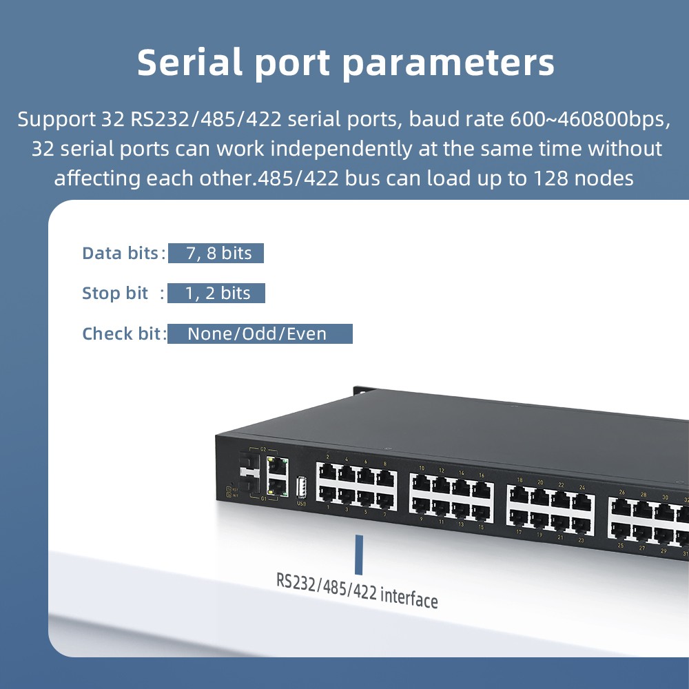 ● 32 independent RS232/485/422 serial ports with RJ45 interface